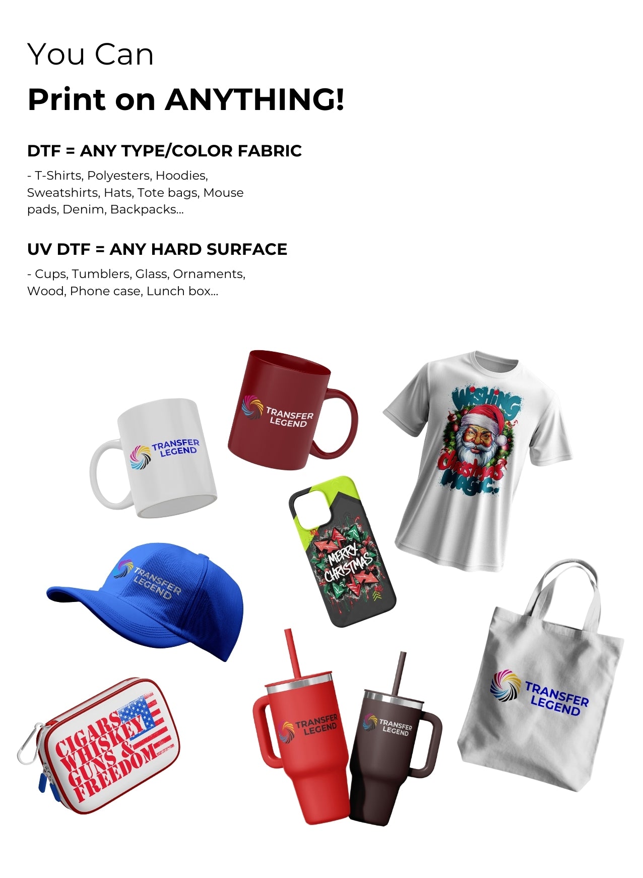 Transfer Legend DTF Transfer prints are a fantastic way to customize your clothing and accessories with vibrant colors, long-lasting durability, and a smooth, soft finish. Thanks to advanced Direct to Film (DTF) technology, these transfers hold up beautifully over time, even after multiple washes. Whether you're personalizing t-shirts, hoodies, or tote bags, you can count on Transfer Legend DTF transfers to deliver crisp, bold designs on cotton, polyester, and blended fabrics.